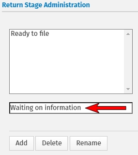 The Admin or a user with the Administrator role can create return stages to assign to tax returns in the return list. This list enables your preparers to assign a stage to a return, such as Missing W-2, Missing Spouse Signature, Paid in Full, or whatever meets your business needs.